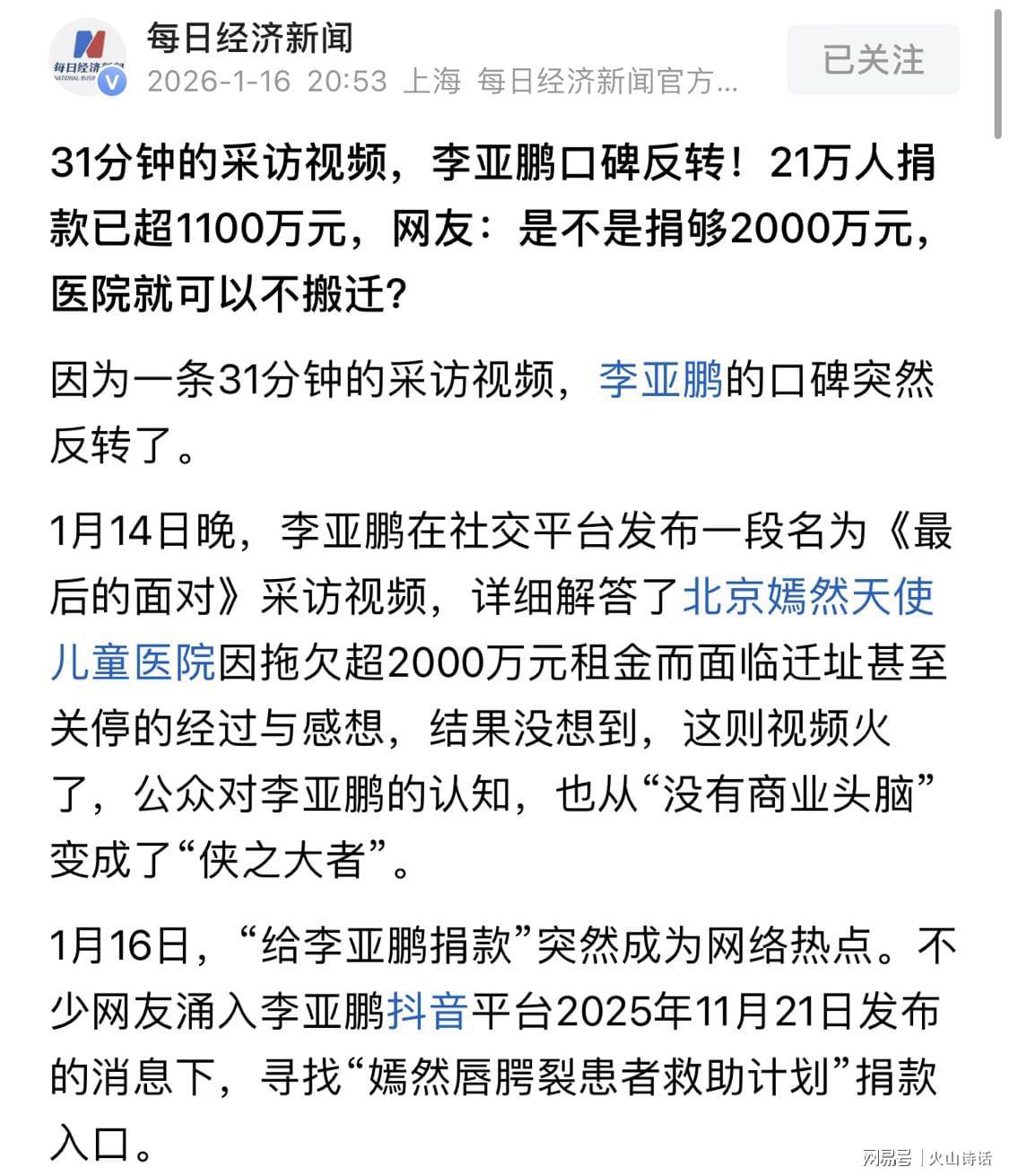 1月14日晚,李亚鹏在社交平台发布一段名为《最后的面对》采访视频,详细解答了北京嫣然天使儿童医院因拖欠超2000万元租金而面临迁址甚至关停的经过与感想,结果没想到,这则视频火了,公众对李亚鹏的认知,也从“没有商业头脑”变成了“侠之大者”。